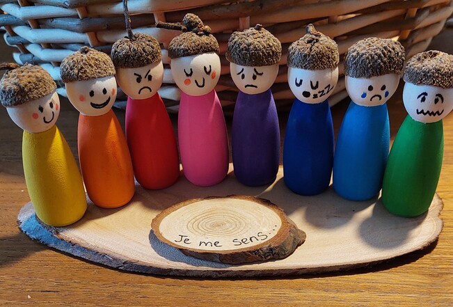 Les enfants peuvent choisir la figurine qui correspond à leur ressenti du moment et la placer sur le socle en bois. Cet exercice simple favorise l’expression des émotions et ouvre le dialogue avec l’adulte.