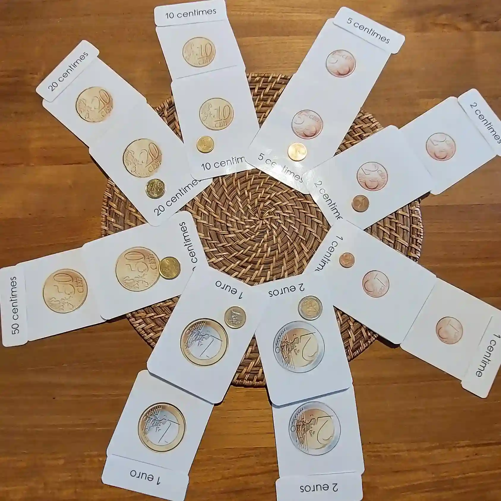 Grâce au kit “Mes petits Euro”, l’enfant enrichit son vocabulaire en nommant les pièces en euros. Il sera capable d’associés le visuelle à l’écriture.