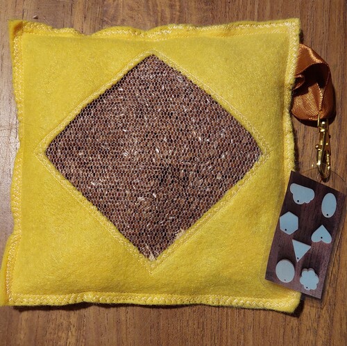 Ce jeu est composé d’un coussin rempli de graines et contenant 7, 8 ou 9 objets en bois à retrouver. Les objets à retrouver sont affichés sur l’étiquette de contrôle accrochée au coussin.